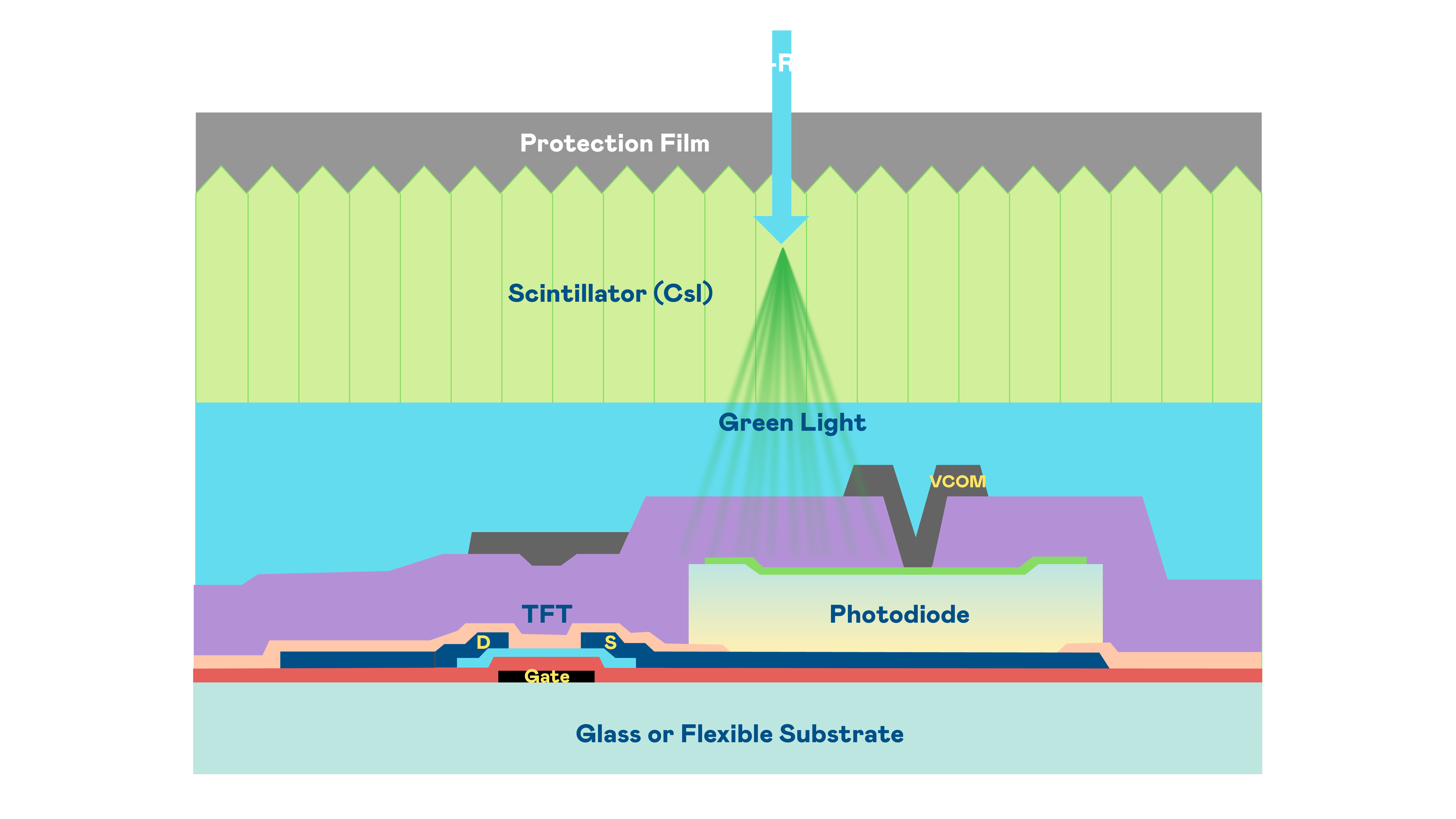 利来国际w66的X光影像感測陣列使用薄膜電晶體 (TFT) 作為每個像素的讀取開關,搭配光電二極體(Photodiode)的光電轉換元件,用以感測X光影像訊號。